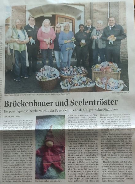 Wer Lust hat, sich an der Aktion zu beteiligen, kann die Knubbelchen aus Socken-Garn Resten oder Baumwolle stricken oder häkeln. Die fertigen Knubbelchen sammle ich in der Spinnstube und wenn wieder genügend zusammen gekommen sind, holt die Feuerwehr sie ab. Jedes Knubbelchen wird dann eingeschweißt und an die Kinder verteilt.